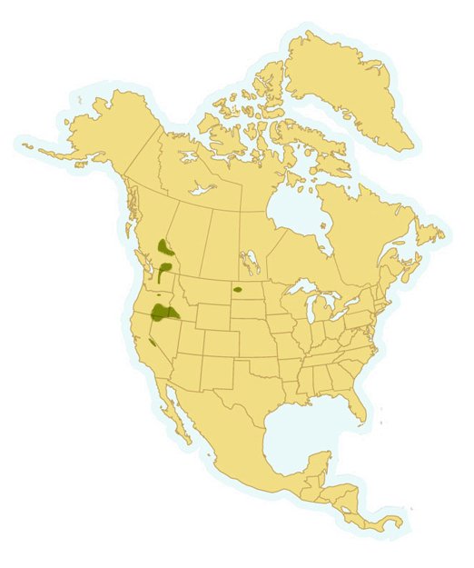 British Columbia: Southern part, in the Caribou, Thompson-Nicola and Okanagan wildlife regions. Idaho: Southwestern part, south of Interstate 84 in Owyhee and Twin Falls counties (non-indigenous). Nevada: Northwestern part, north of Interstate 80 in Washoe, Humboldt and western Elko counties. Oregon: Southeastern part, mainly in Harney and Malheur counties. Utah: Small population in the northwestern part of the state. Washington: North-central part, near the B.C. border in Okanogan and Ferry counties; central part, in Kittitas and Yakima counties; and southeastern part, in Asotin, Garfield and Columbia counties.